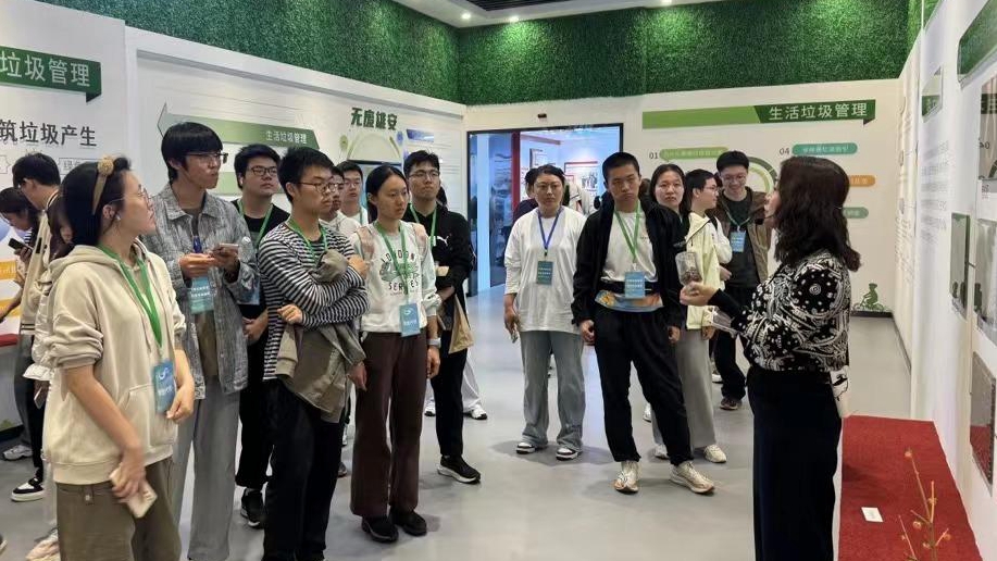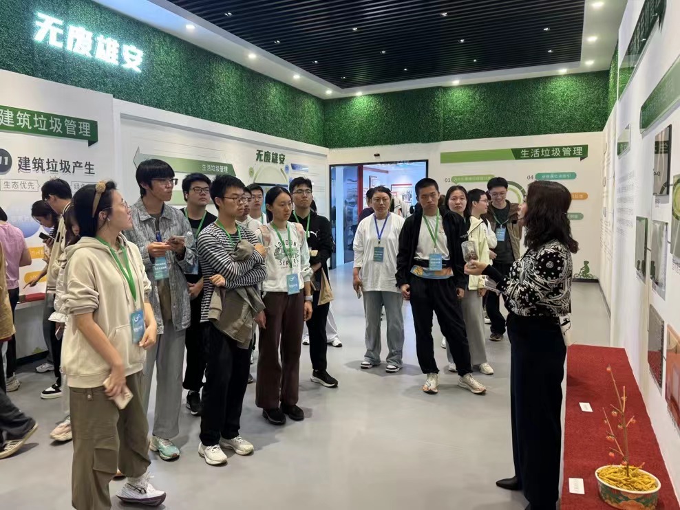 10月12日,在容东片区环卫设施北停车场环教展示中心,工作人员为高校学生讲解“无废雄安”建设进展。新华社记者 王美祺 摄