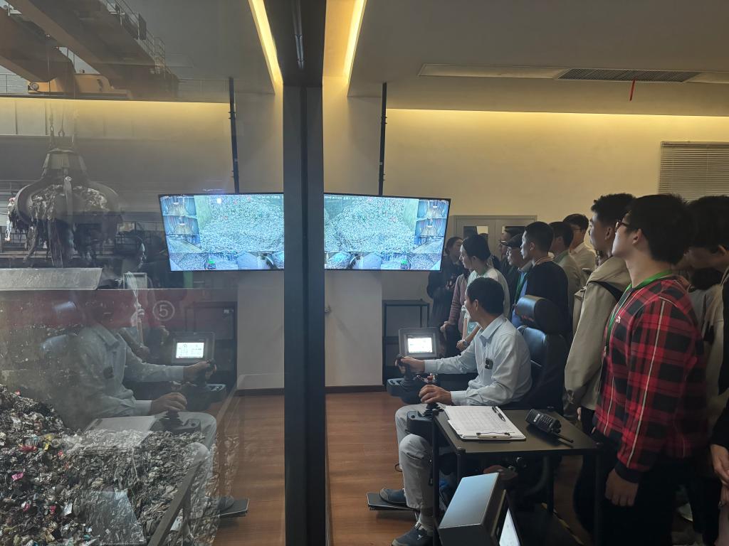 10月12日,在河北雄安光大生态产业园,师生们观看工作人员操作智能垃圾吊将生活垃圾运往焚烧炉。新华社记者 王美祺 摄
