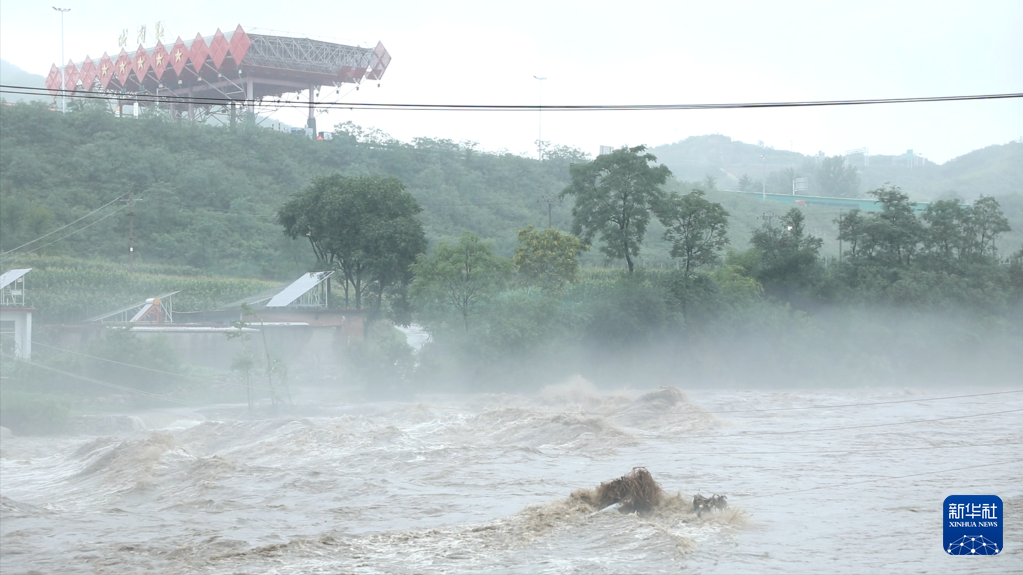 河北省阜平县城南庄镇大岸底村位于太行山区,受极端暴雨天气影响,流经城南庄镇的胭脂河水位持续上涨,河中漂浮着被冲毁的树木,部分玉米倒伏在水中,河水不断冲击着岸边。