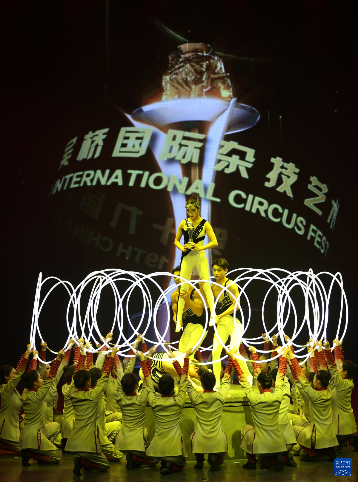 2023年10月30日,演员在第十九届中国吴桥国际杂技艺术节闭幕式颁奖晚会上表演节目。新华社记者 骆学峰 摄