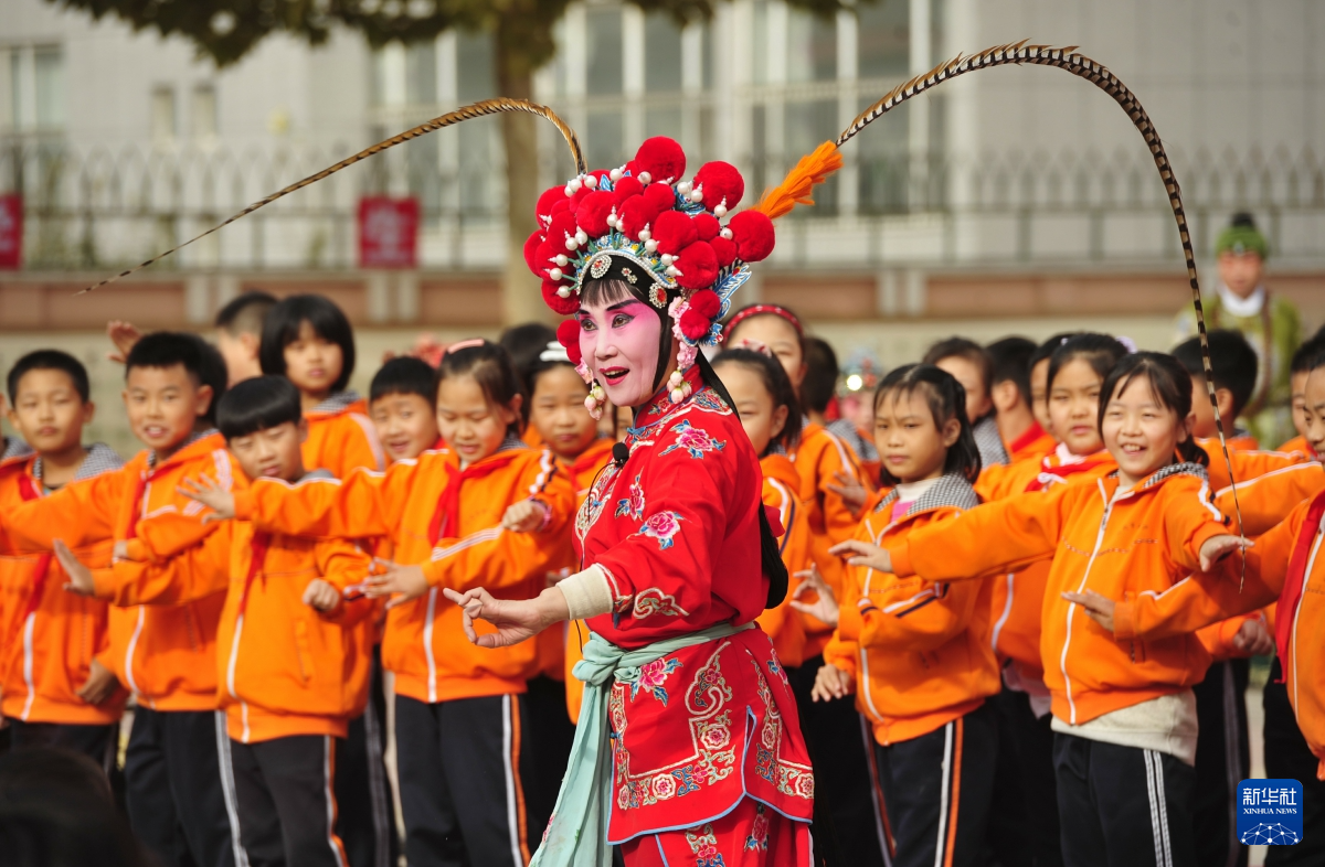 2020年10月30日,河北省黄骅市河北梆子剧团演员在沧州河间市一所小学演出。新华社记者 朱旭东 摄