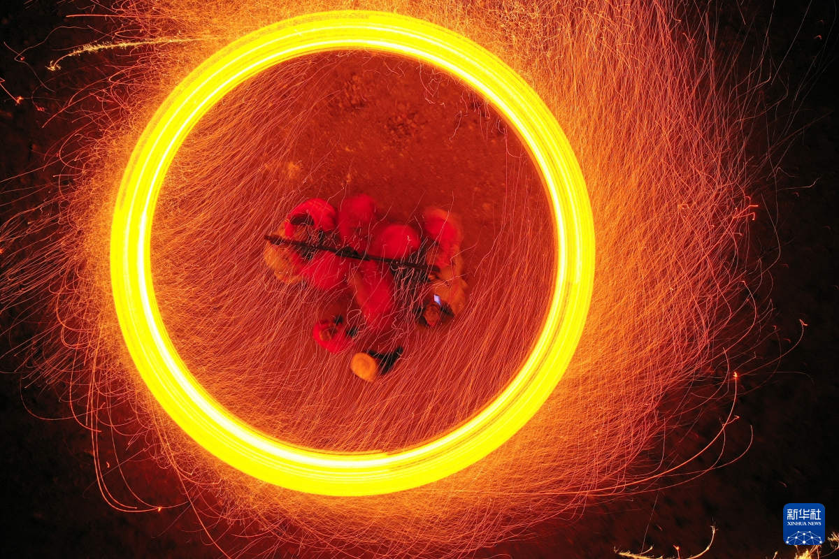 2023年7月5日,河北省滦平县火斗山镇大店子村的民间艺人在表演“抡花”(无人机照片)。新华社记者 牟宇 摄