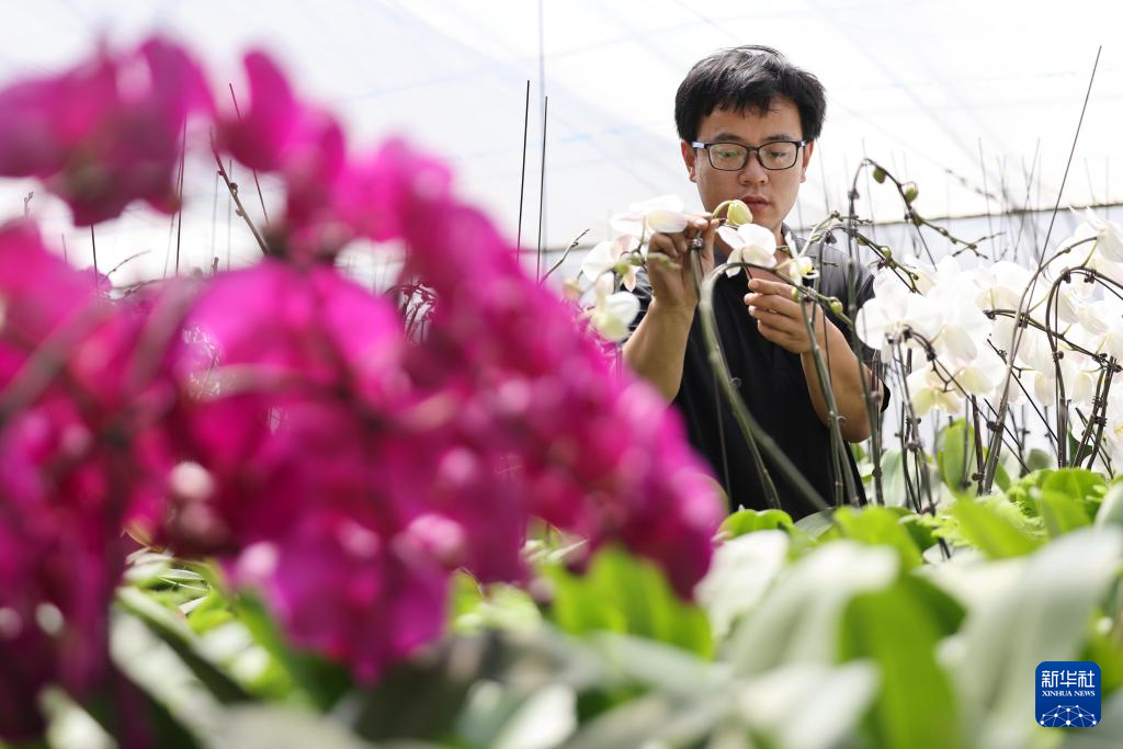 6月1日,在石家庄藁城区石家庄品梦花卉种植有限公司温室大棚,工作人员在管护花卉。