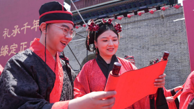 5月17日,河北省石家庄市首届汉式集体婚礼在古城正定举行。活动现场,25对身着汉式婚礼袍服的新人行对拜礼、饮合卺酒、诵婚书、传家训,再现中华传统婚典文化的古韵之美。本次活动旨在提倡节俭朴素新风尚,让广大青年树立正确的婚恋观和家庭观。