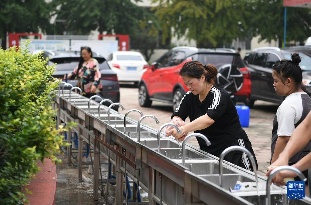 8月3日,安置群众在涿州市第三中学安置点内盥洗。新华社记者牟宇 摄