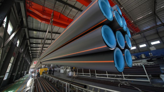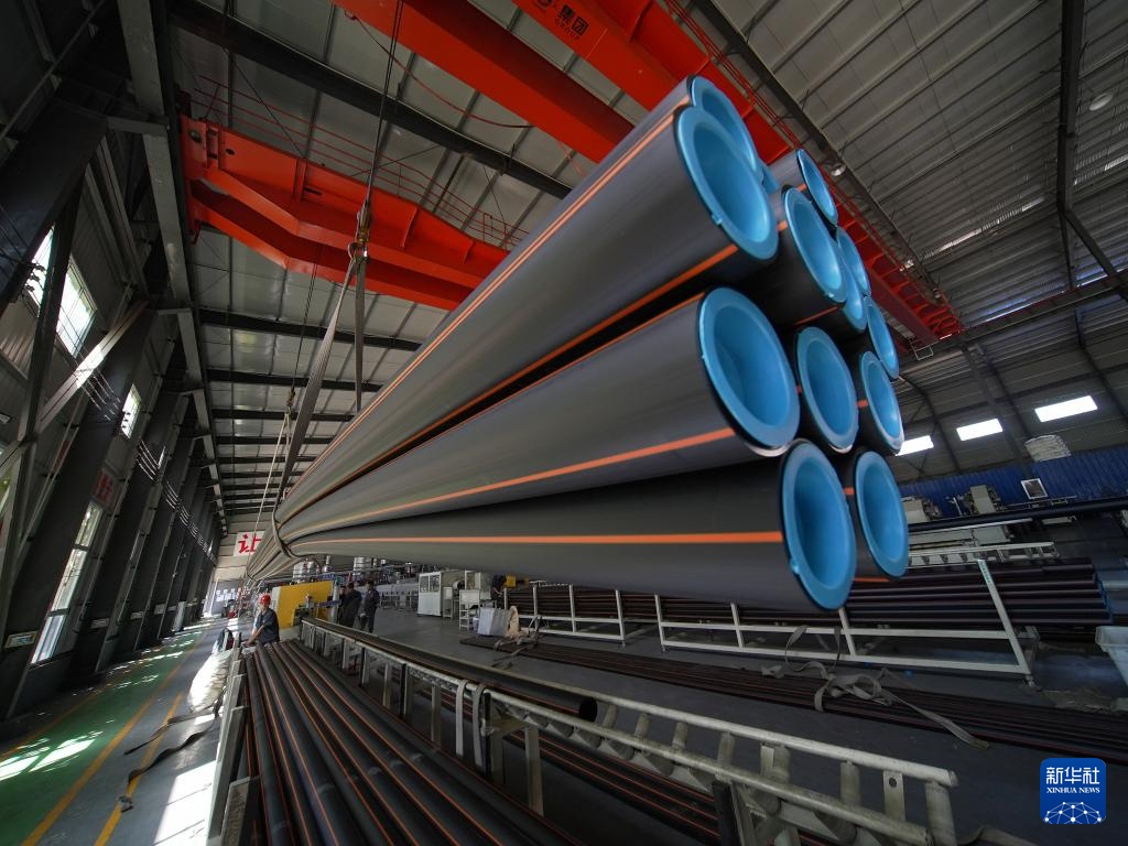 8月22日,工人在河北省沧州市孟村回族自治县河北一塑管道制造有限责任公司聚乙烯管材生产车间进行聚乙烯燃气管材吊装。