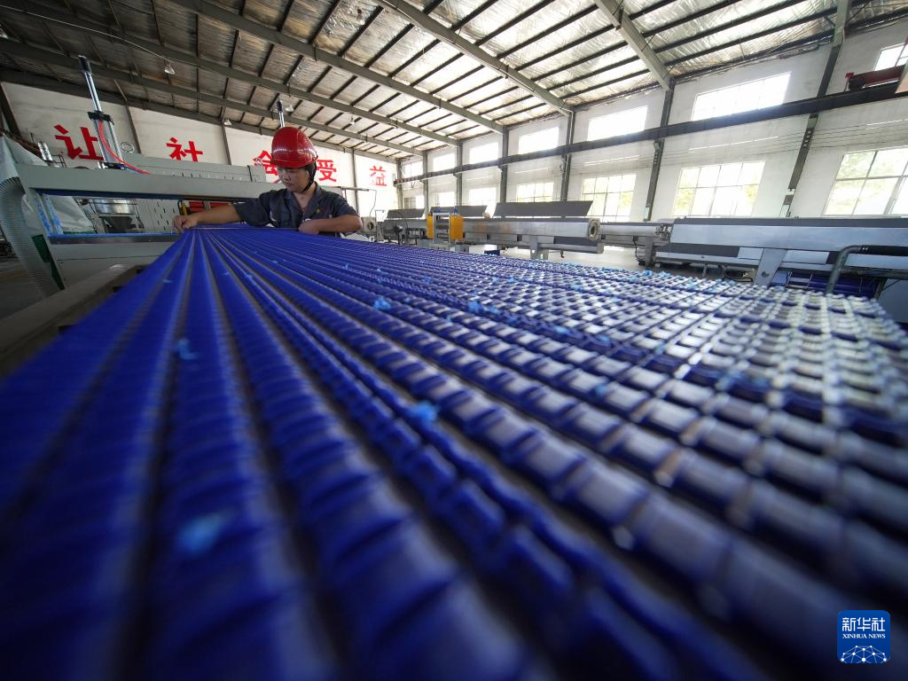 8月22日,工人在河北省沧州市孟村回族自治县河北一塑管道制造有限责任公司海洋踏板生产车间进行海洋踏板产品下线测量。