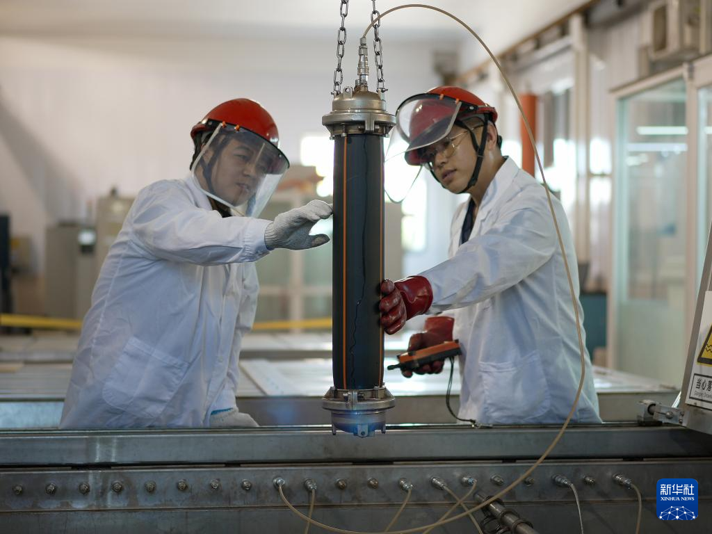 8月22日,工人在河北省沧州市孟村回族自治县河北龙锦管道装备有限公司生产车间进行预制产品调试。