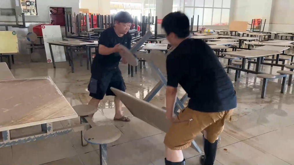河北省涿州市双塔中学是当地此次受灾较为严重的学校之一,学校二层以下几乎全部被洪水淹没。截至13日中午,这里的清淤工作已进入最后收尾阶段。