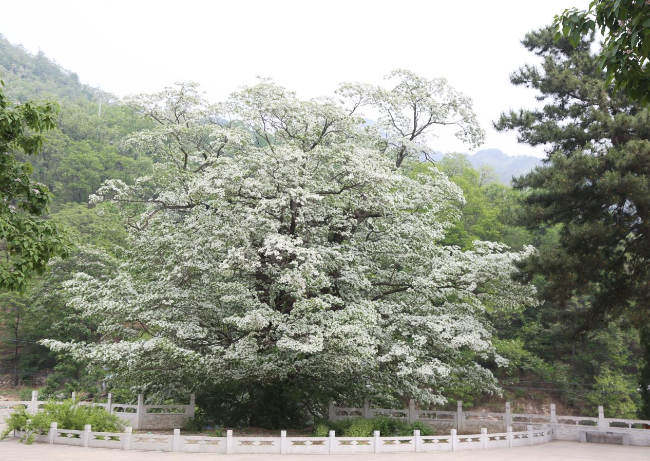 流苏树是国家二级保护植物,树形高大优美,枝条纤细而柔韧,每到盛花期,整株树木犹如覆霜盖雪,其花、嫩叶皆可作茶。在太行山深处的灵寿县车谷坨村,就有一棵古流苏树,树龄1100多年,树高14米,树围3.4米,冠幅17米,矗立于山石之间,树旁有松柏相伴。