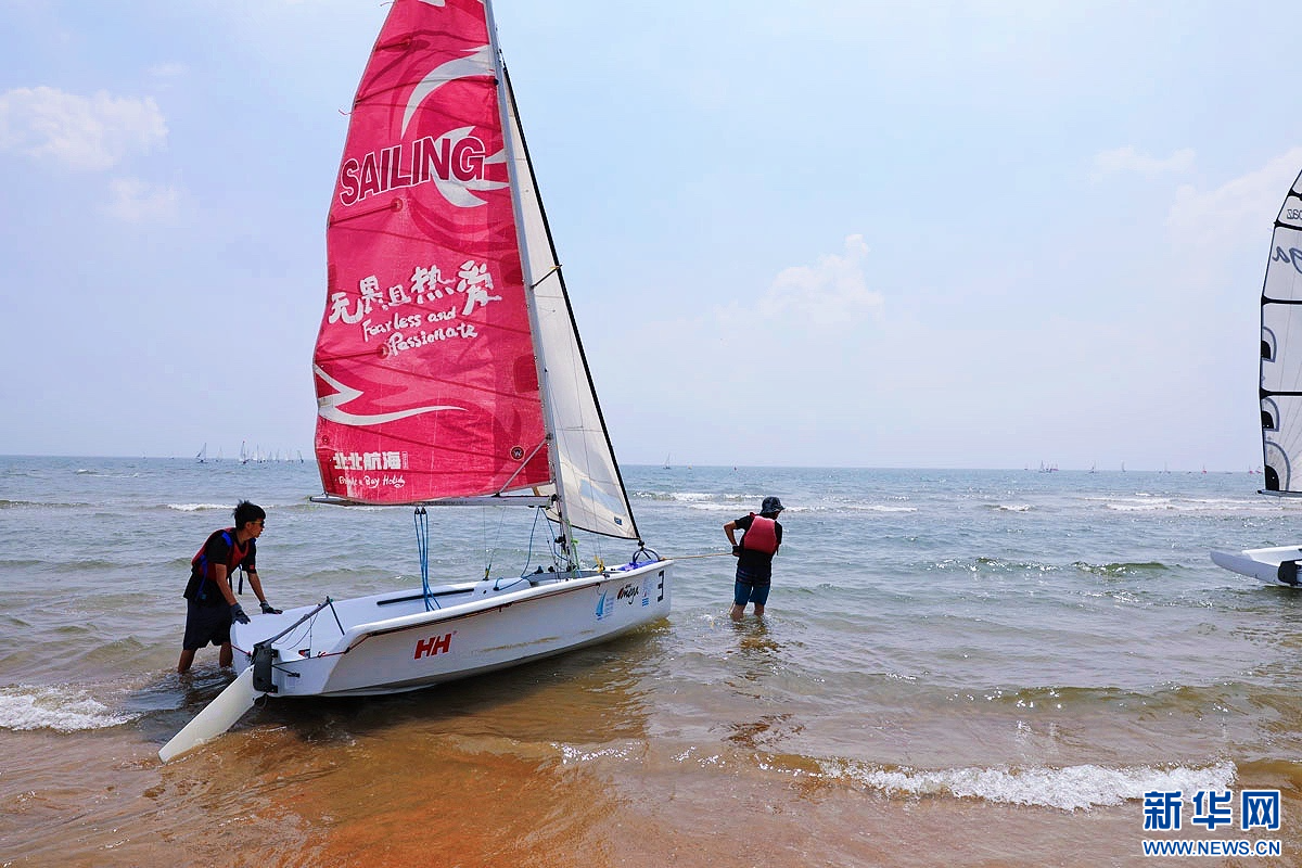 学员们将帆船从岸边拖到海中。新华网 魏会博摄