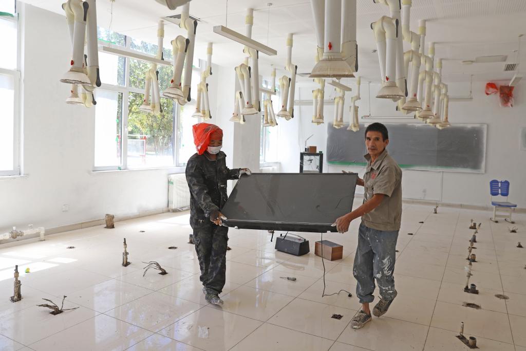 在涿州市高新区学校筑梦楼内,两名工人正在修复受损教室。熊华明摄