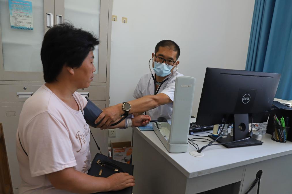在涿州市码头镇中心卫生院,医护人员正在为前来就诊的村民测量血压。班静怡摄