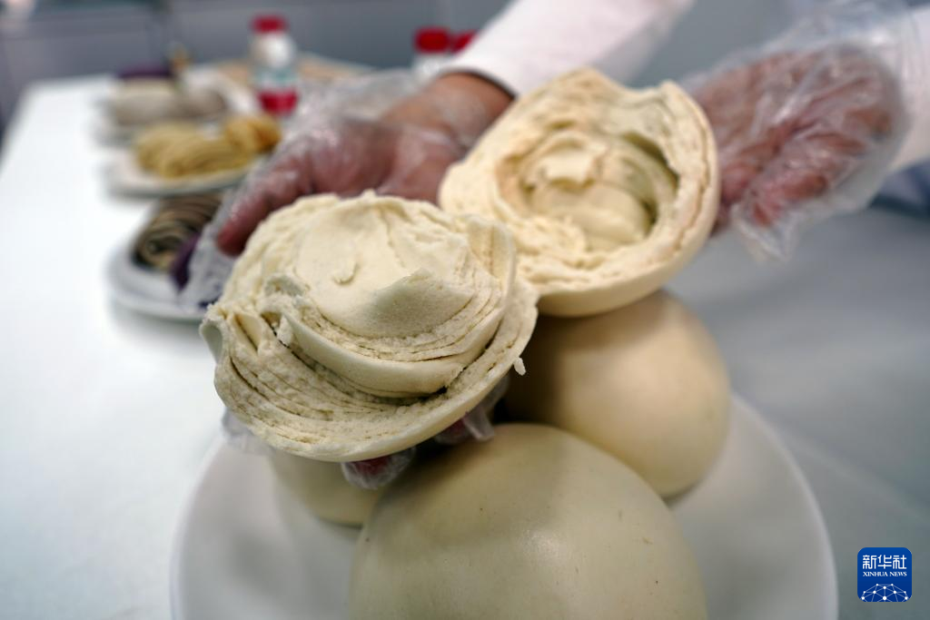 5月25日,在河北沧州渤海新区黄骅市一家农业科技公司尊龙pa旗舰厅官网的产品展示厅,工作人员展示旱碱麦千层馒头。
