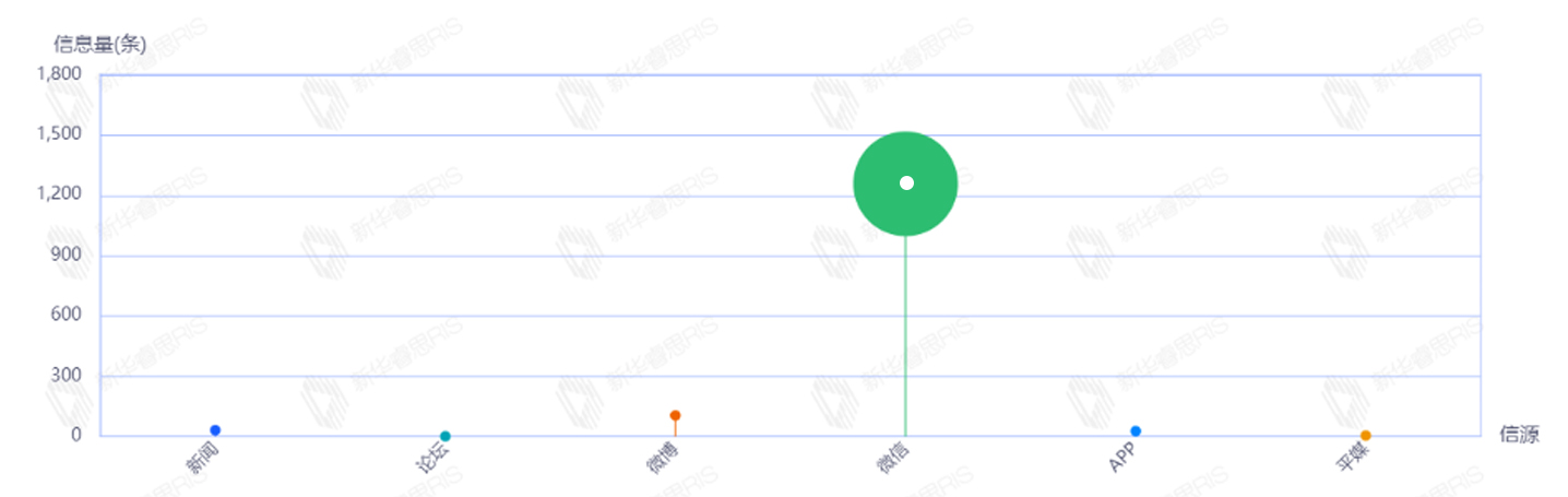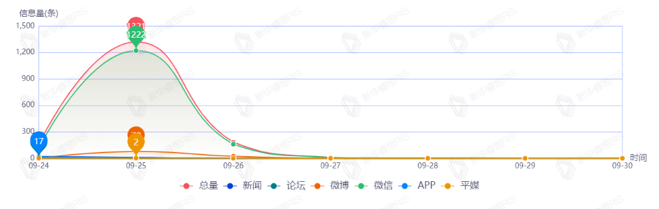 9月24日至9月30日,该文章在互联网上传播总量为1679篇。其中9月25日是信息发布的高峰期,发布信息量为1321篇文章。各信源的信息发布情况中,微信信息占比最大,其次是微博和新闻,信息量分别为1257、104、31,占比分别为88.40%、7.31%、2.18%。(数据来源:新华睿思数据云图分析平台)