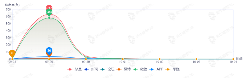 9月28日至10月4日,该文章在互联网上传播总量为697篇。其中9月29日是信息发布的高峰期,发布信息量为637篇文章。各信源的信息发布情况中,微信信息占比最大,其次是app和新闻,信息量分别为534、51、17,占比分别为87.11%、8.32%、2.77%。(数据来源:新华睿思数据云图分析平台)