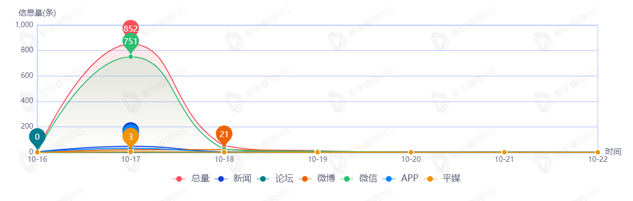 10月16日至10月22日,该文章在互联网上传播总量为925篇。其中10月17日是信息发布的高峰期,发布信息量为852篇文章。各信源的信息发布情况中,微信信息占比最大,其次是新闻和微博,信息量分别为636、54、45,占比分别为81.96%、6.96%、5.80%。(数据来源:新华睿思数据云图分析平台)