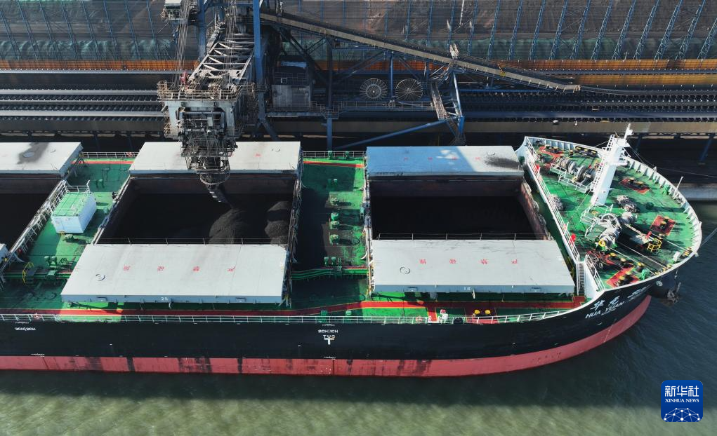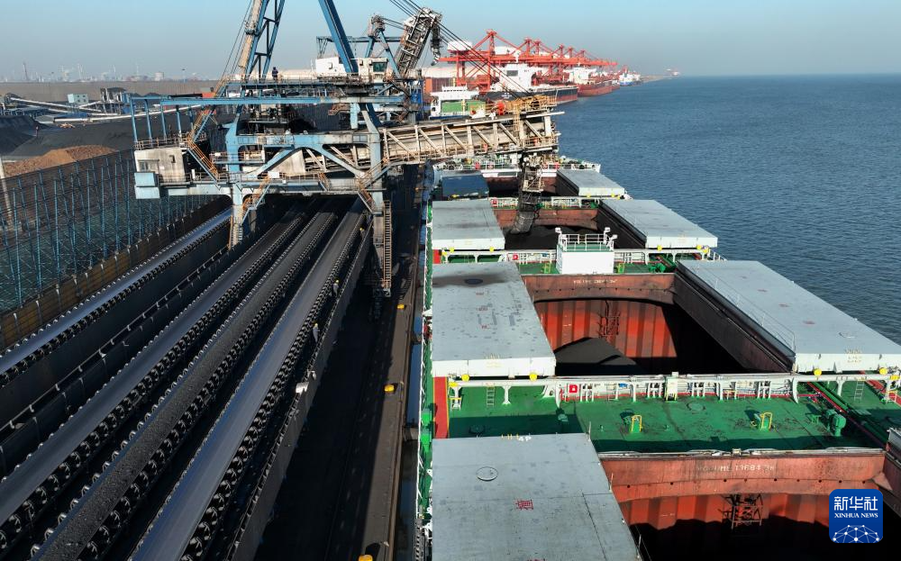1月28日,一艘轮船靠泊在唐山港京唐港区煤炭码头装货(无人机照片)。