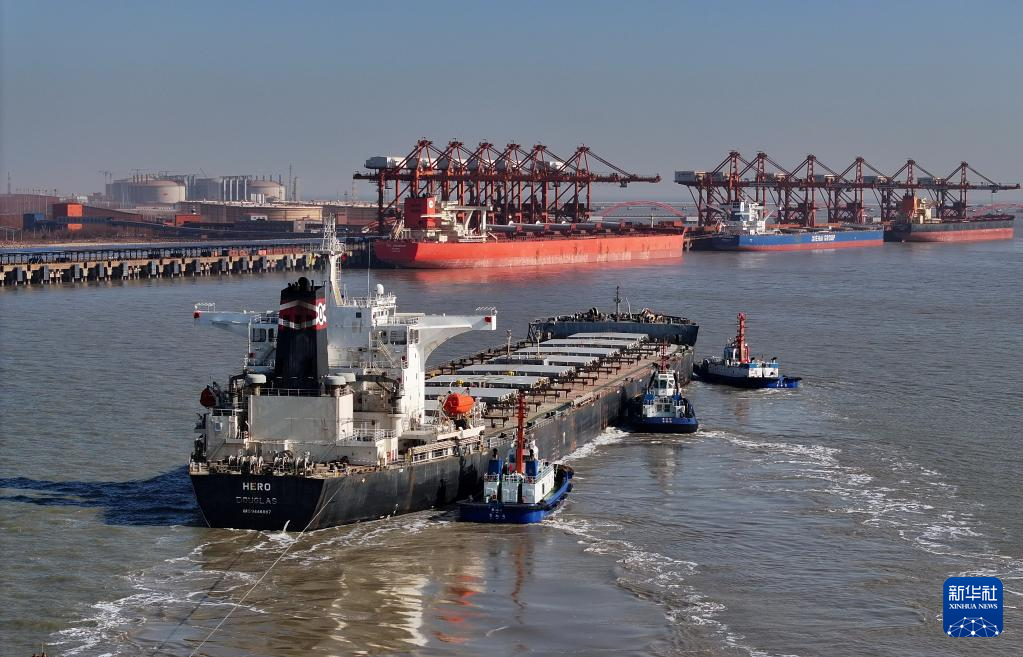 1月26日,一艘轮船在拖轮协助下向唐山港曹妃甸港区矿石码头靠泊(无人机照片)。