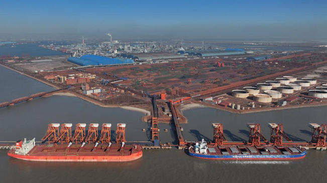 1月28日,两艘轮船靠泊在唐山港京唐港区矿石码头卸载(无人机照片)。