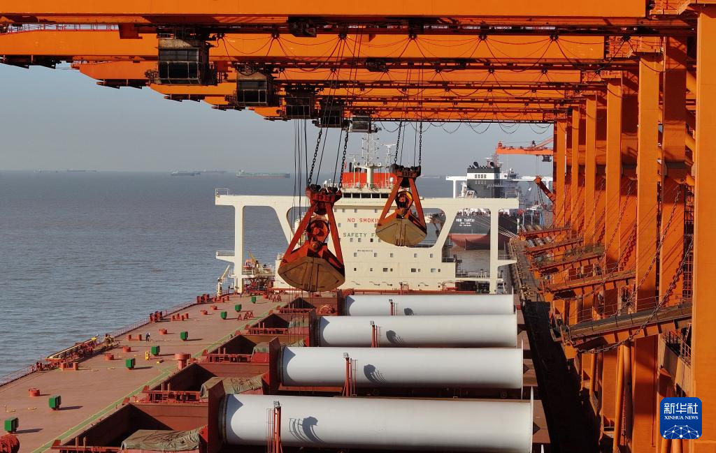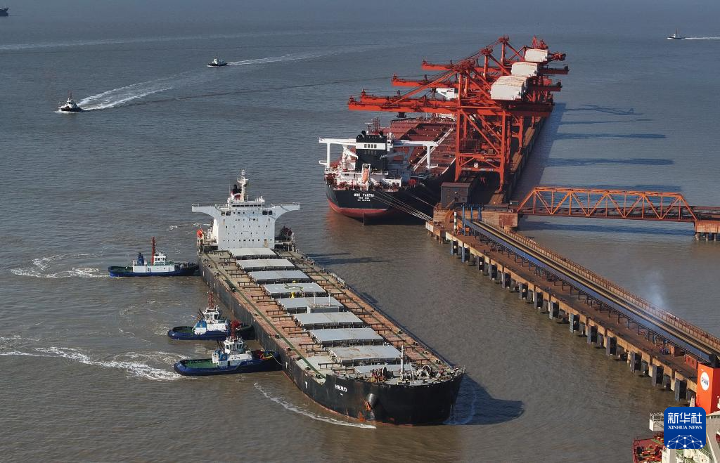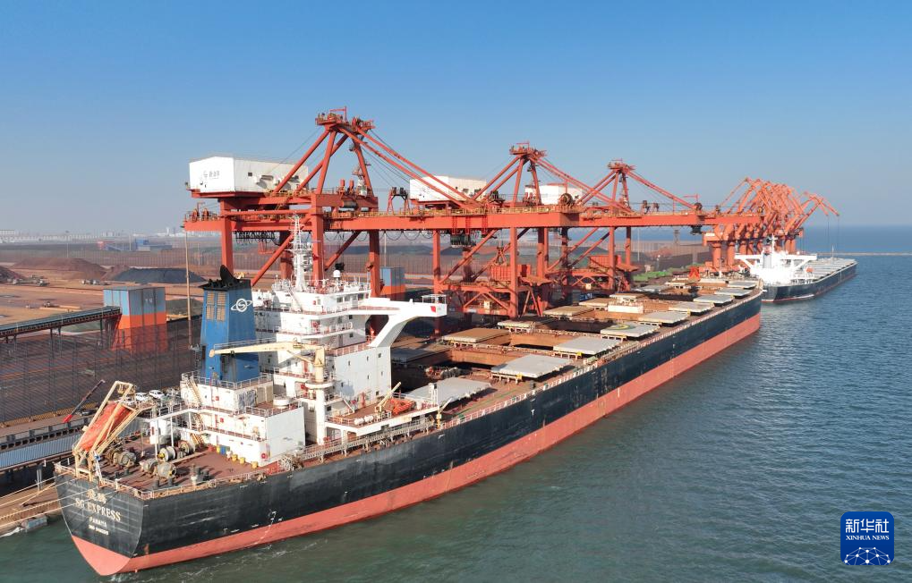 1月28日,一艘轮船靠泊在唐山港京唐港区矿石码头卸载(无人机照片)。