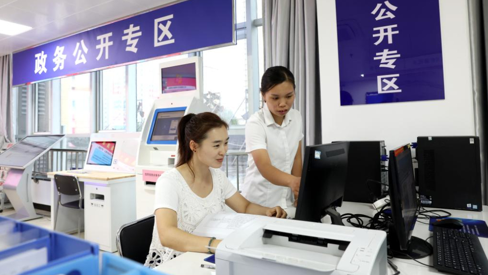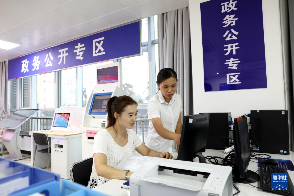 9月20日,河北元氏经济开发区行政审批局工作人员(右一)指导企业办事员进行业务填报工作。(梁子栋 摄)