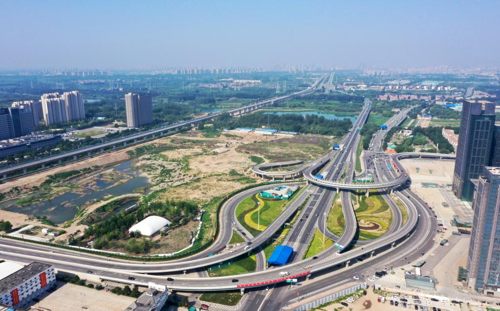 京唐城际铁路(燕郊段)及改造后的通燕高速燕郊出口立交枢纽。(受访者供图)