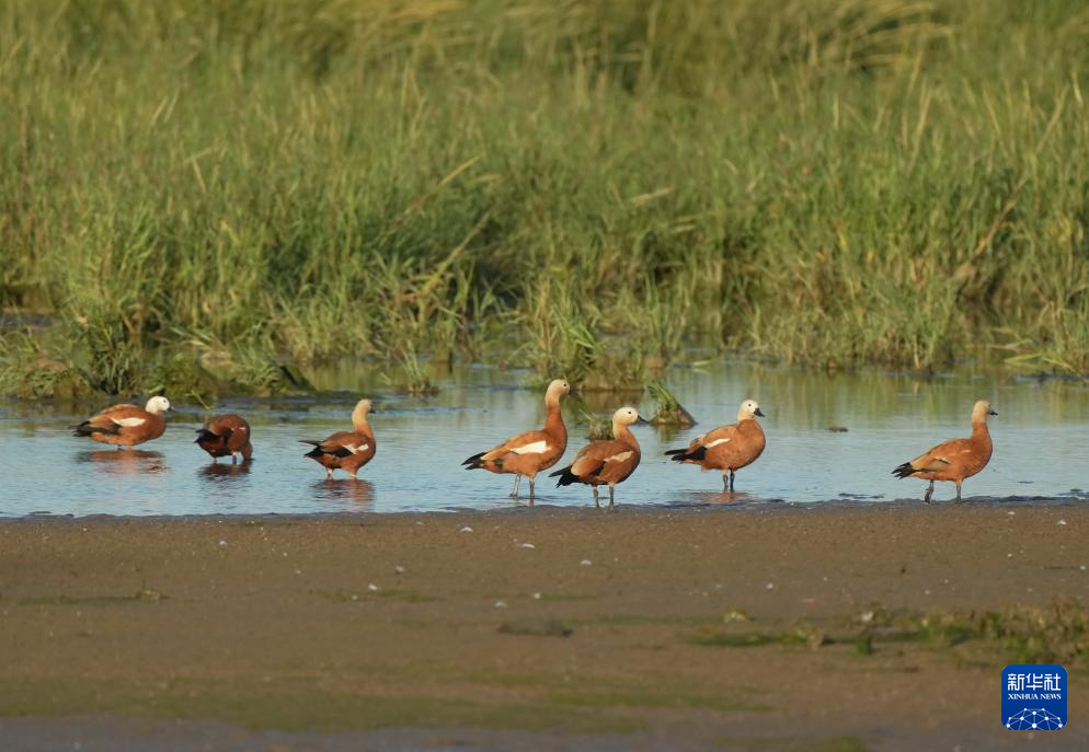 9月23日,一群赤麻鸭在河北省秦皇岛市北戴河区沿海湿地觅食。
