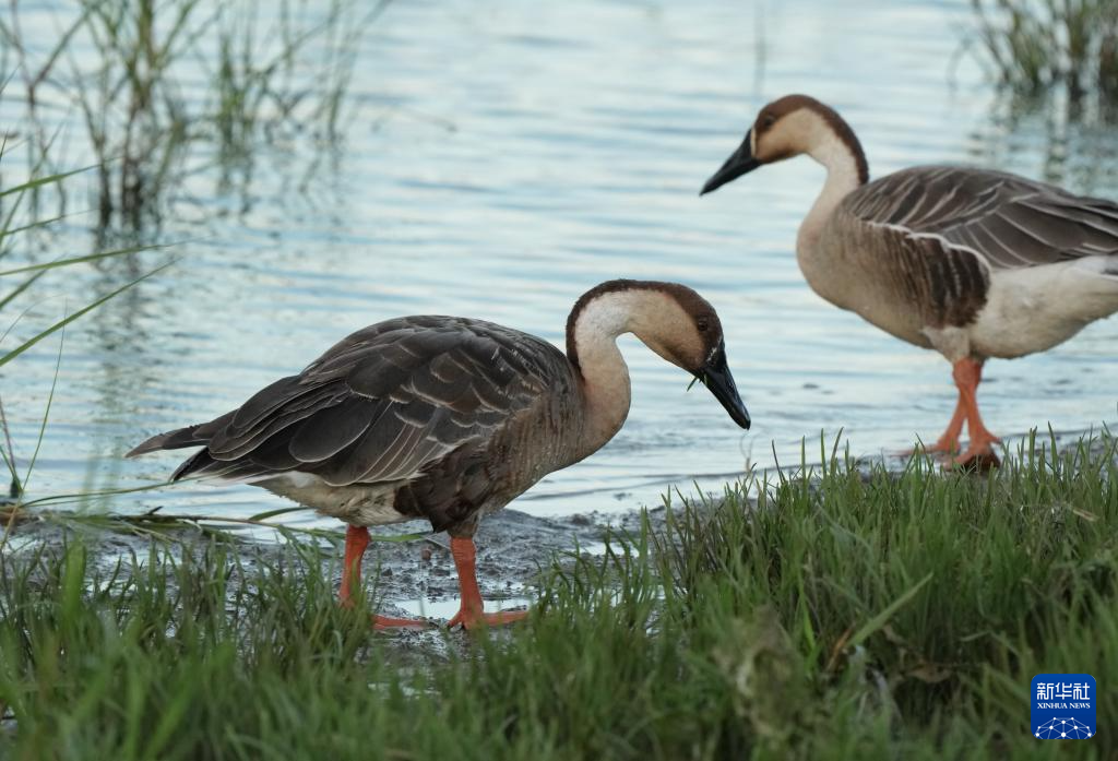 9月23日,两只鸿雁在河北省秦皇岛市北戴河区沿海湿地觅食。
