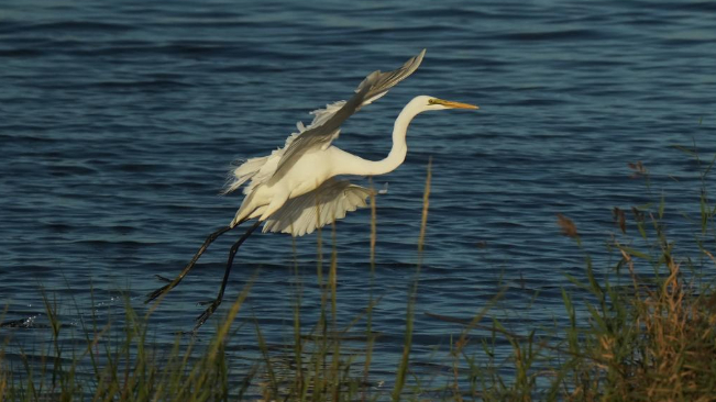 9月23日,一只白鹭在河北省秦皇岛市北戴河区沿海湿地飞舞。
