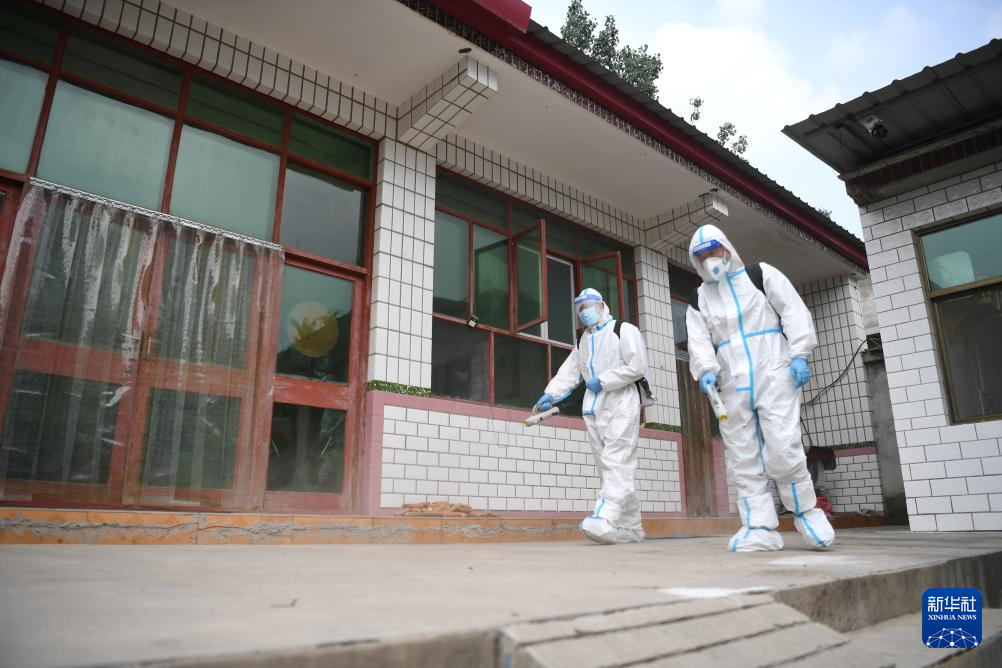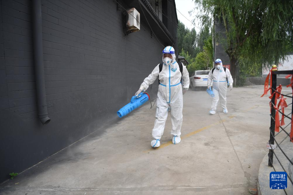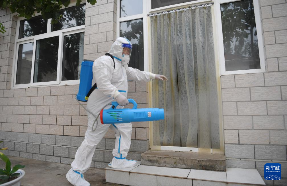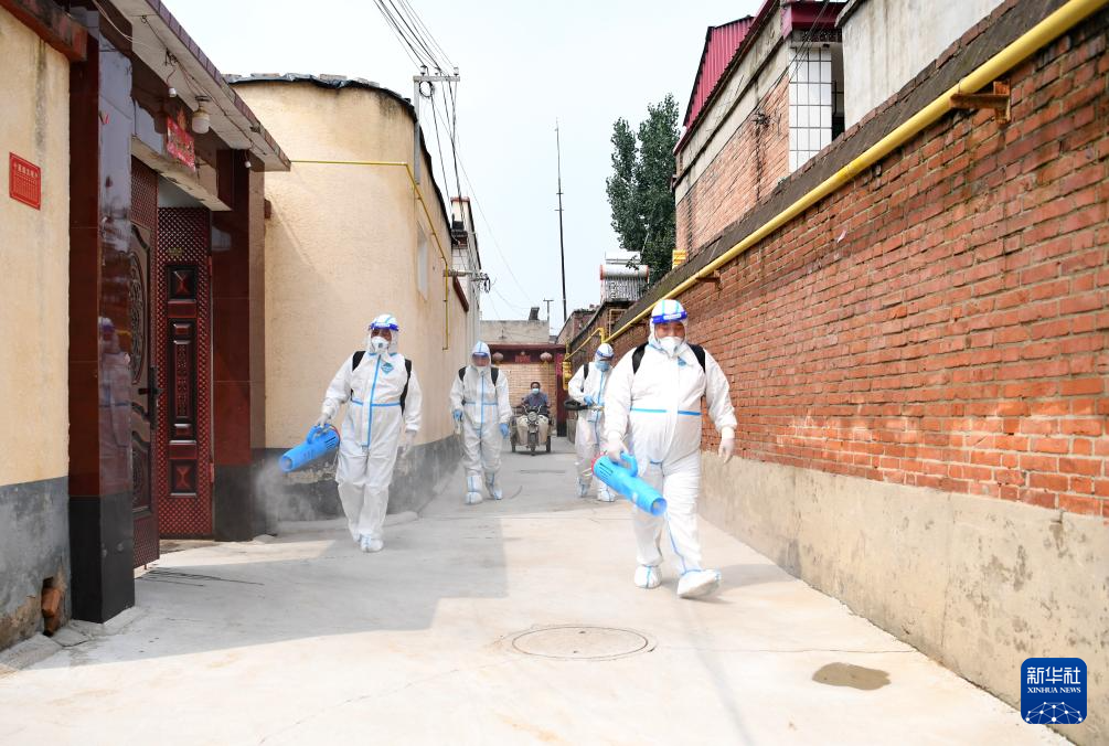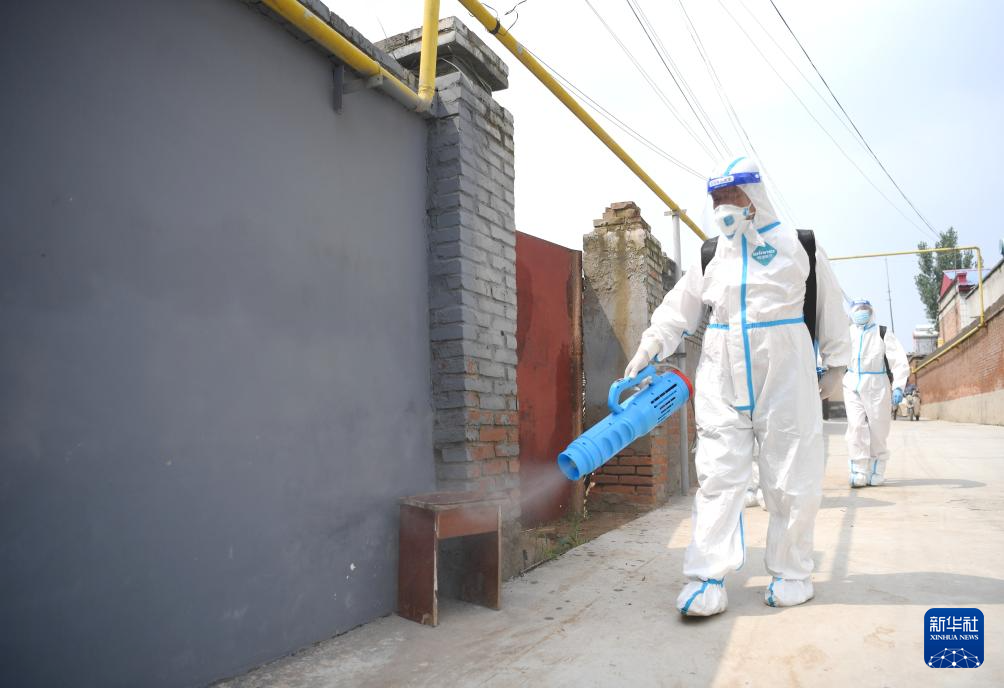 8月8日,工作人员在涿州市桃园街道忠义店村入户开展防疫消杀作业。