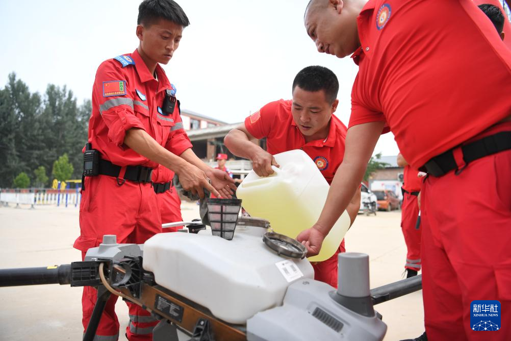 8月8日,工作人员在涿州市桃园街道忠义店村为消杀无人机加注消毒液。