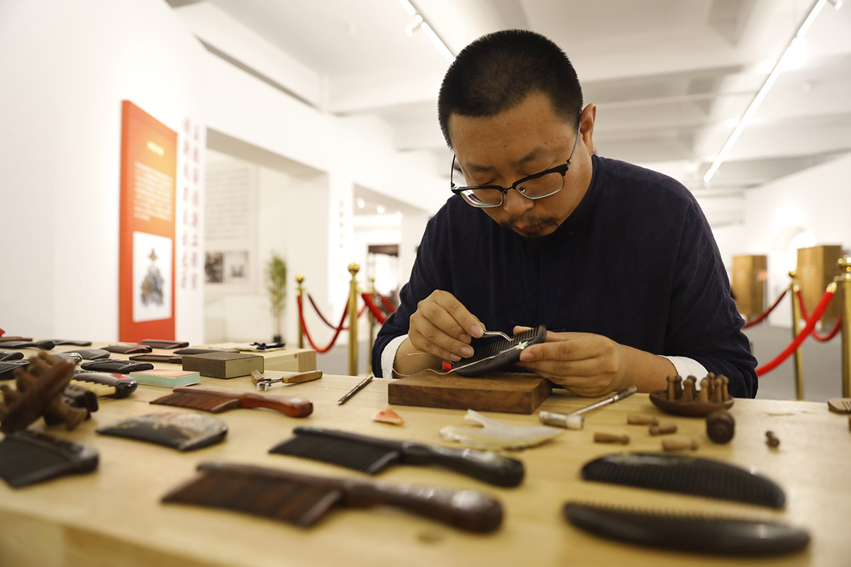 非遗传承人董良演示木梳制作技艺。王立鹏 摄