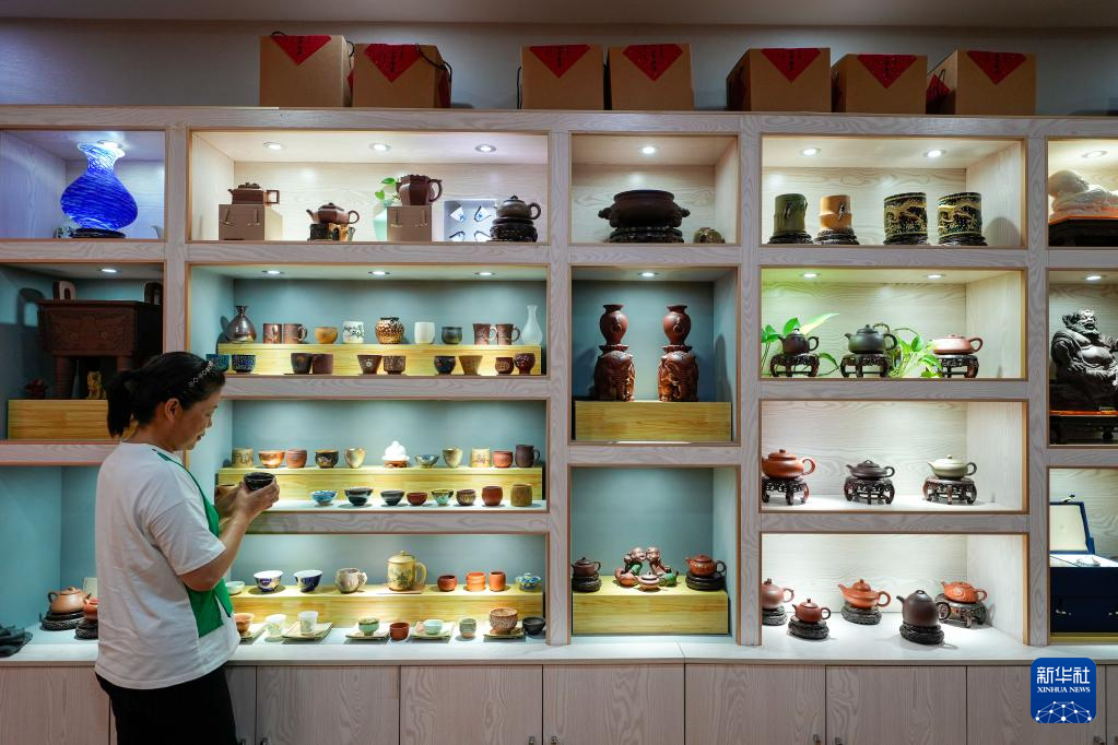 启新1889文化创意产业园一家商铺的工作人员在整理文创产品(7月2日摄)。