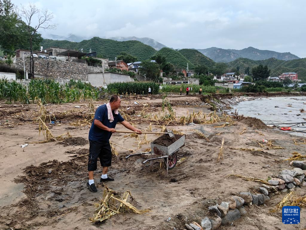 8月7日,涞水县赵各庄镇汤家庄村民在菜地里清理山洪冲积的泥沙。新华社记者 曹国厂 摄