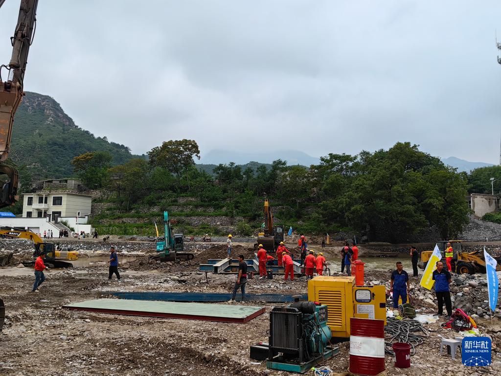 8月6日下午,救援人员在涞水赵各庄镇汤家庄村口河道上架桥。新华社记者 曹国厂 摄