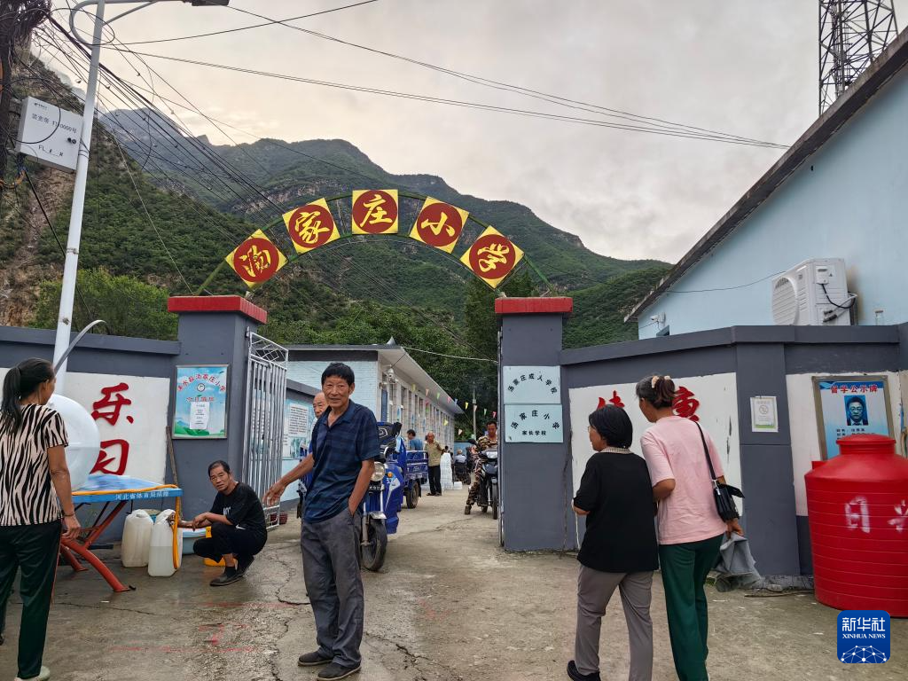 8月7日,村民在涞水县赵各庄镇汤家庄小学门口取水。新华社记者 曹国厂 摄