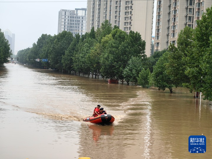 8月2日,救援人员在涿州市内乘冲锋舟救援转移群众。新华社记者 高博 摄
