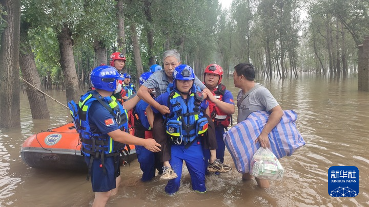 8月4日,在河北省涿州市汛情重灾区码头镇沙窝村,贵州蓝天救援队队员在转移受困村民。新华社发