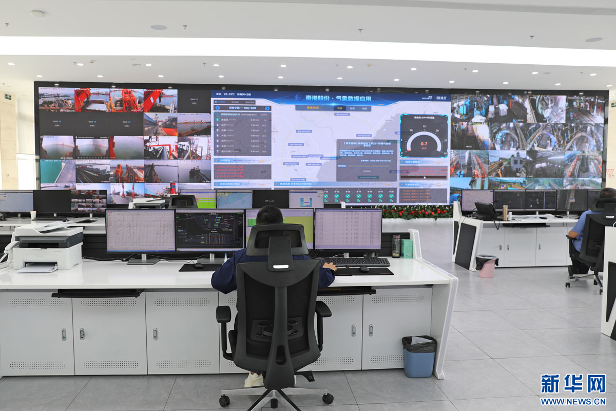 巨大的电子屏显示着各码头实时作业场景