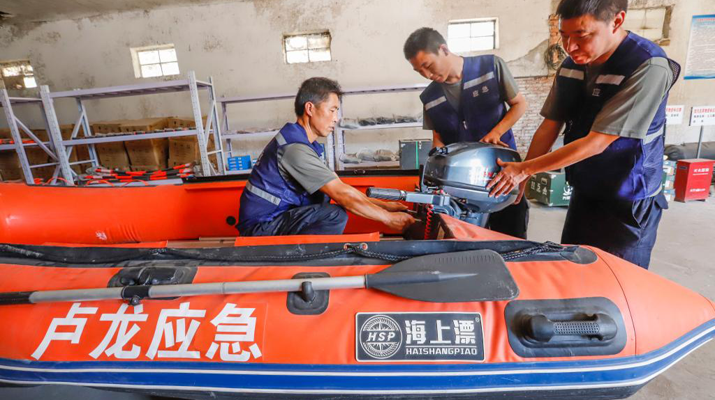 6月28日,工作人员在河北省秦皇岛市卢龙县应急物资储备库组装救援橡皮艇。