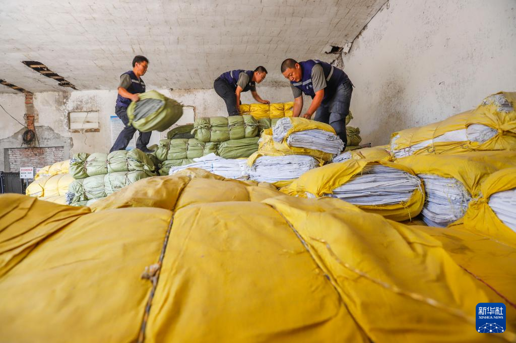 6月28日,工作人员在河北省秦皇岛市卢龙县应急物资储备库码放防洪物资。