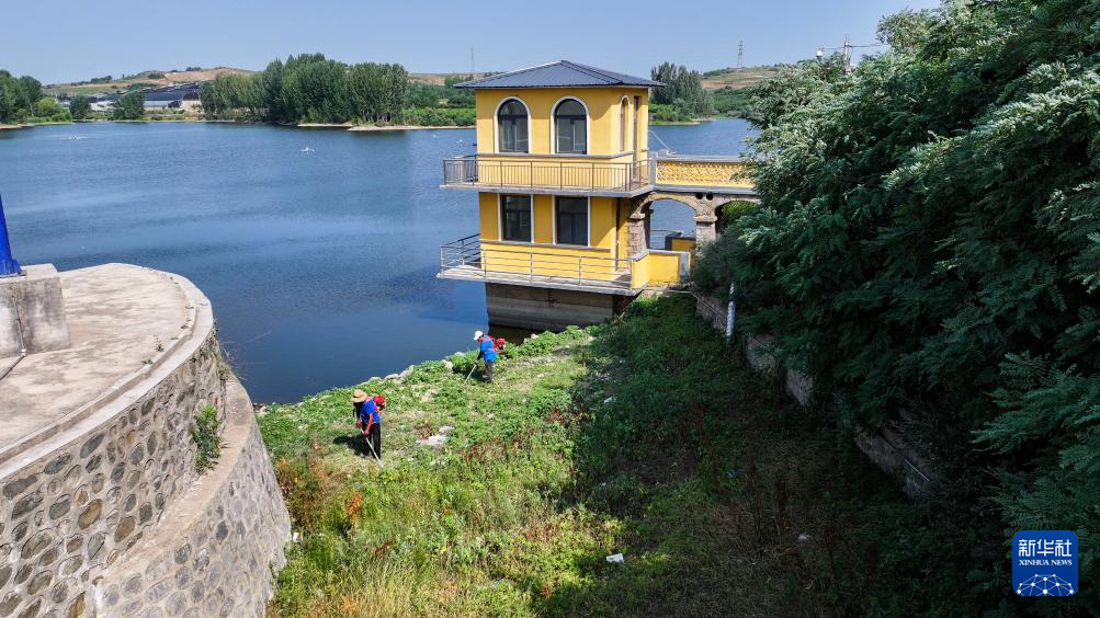 6月28日,工作人员在河北省秦皇岛市卢龙县双望镇黄家村水库清理溢洪道杂草(无人机照片)。