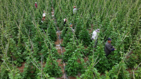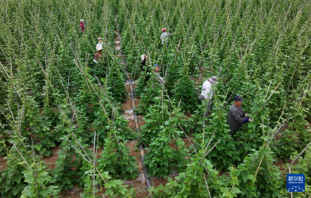 7月23日,河北省隆化县偏坡营镇一家蔬菜种植合作社的社员管护豆角秧(无人机照片)。