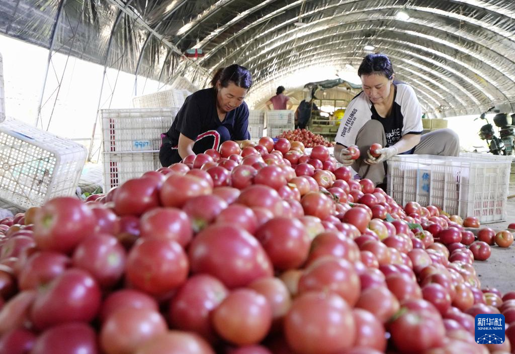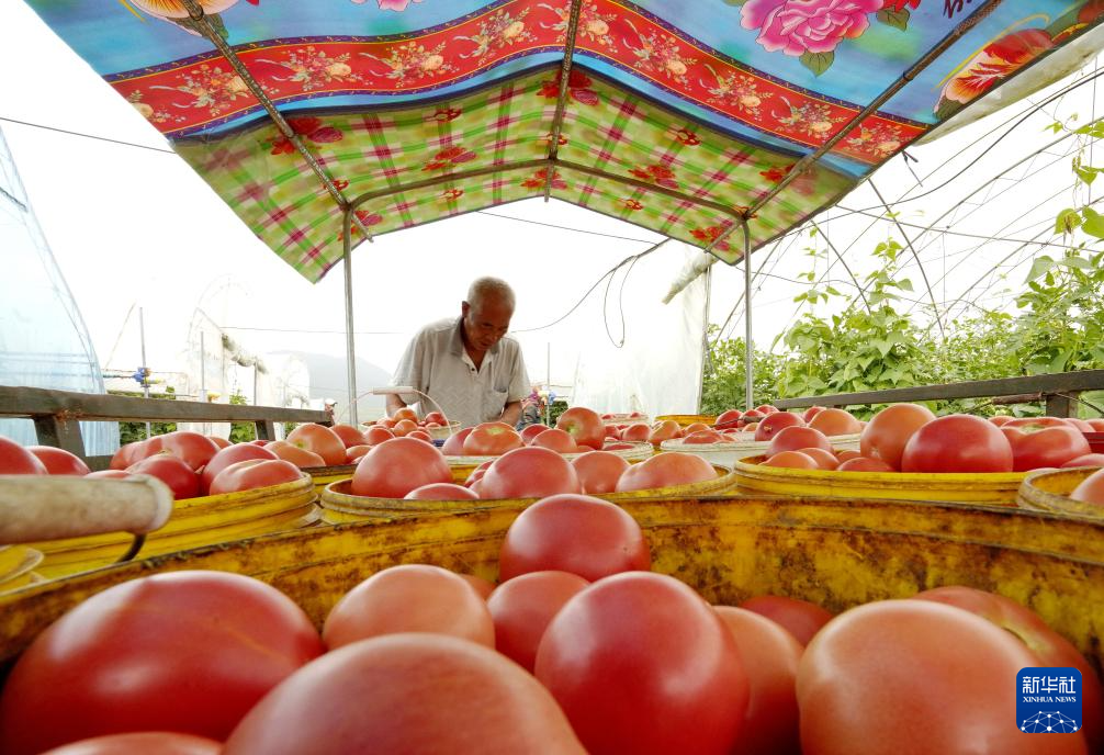 7月24日,河北省隆化县汤头沟镇一家蔬菜种植合作社的社员分拣西红柿。