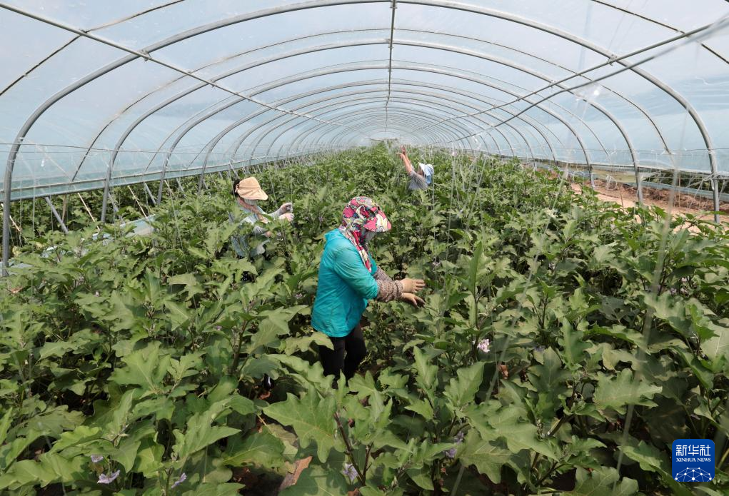 7月24日,河北省隆化县偏坡营镇一家蔬菜种植合作社的社员管护茄子秧。