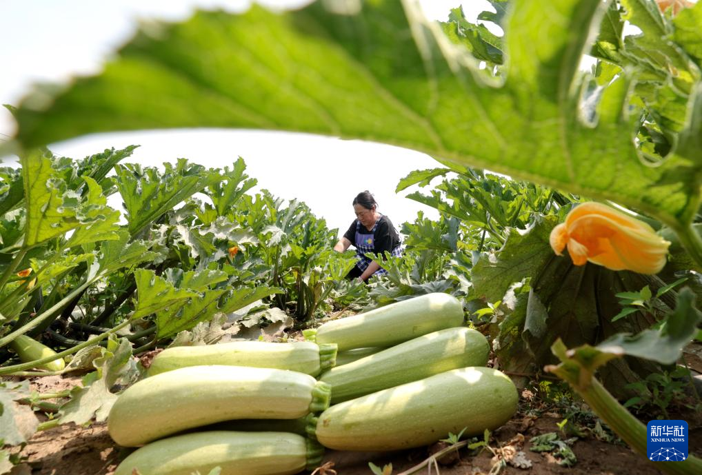 7月24日,河北省隆化县偏坡营镇一家蔬菜种植合作社的社员采摘西葫芦。