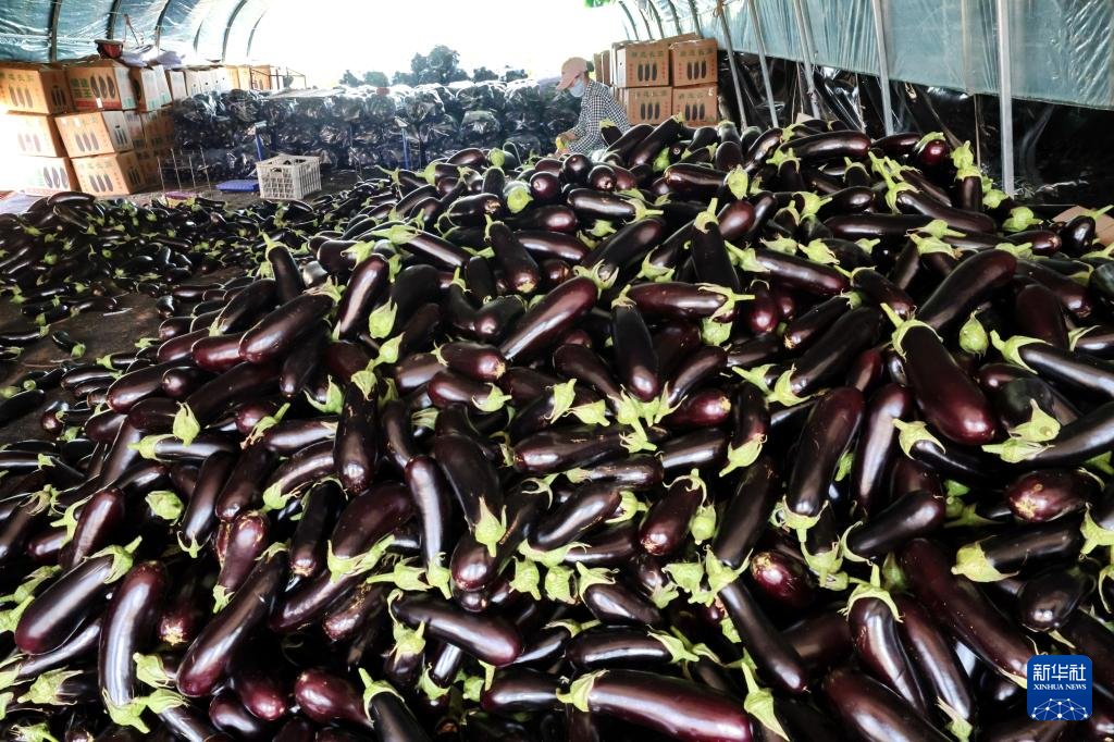 7月24日,河北省隆化县偏坡营镇一家蔬菜种植合作社的社员分拣刚采摘的茄子。