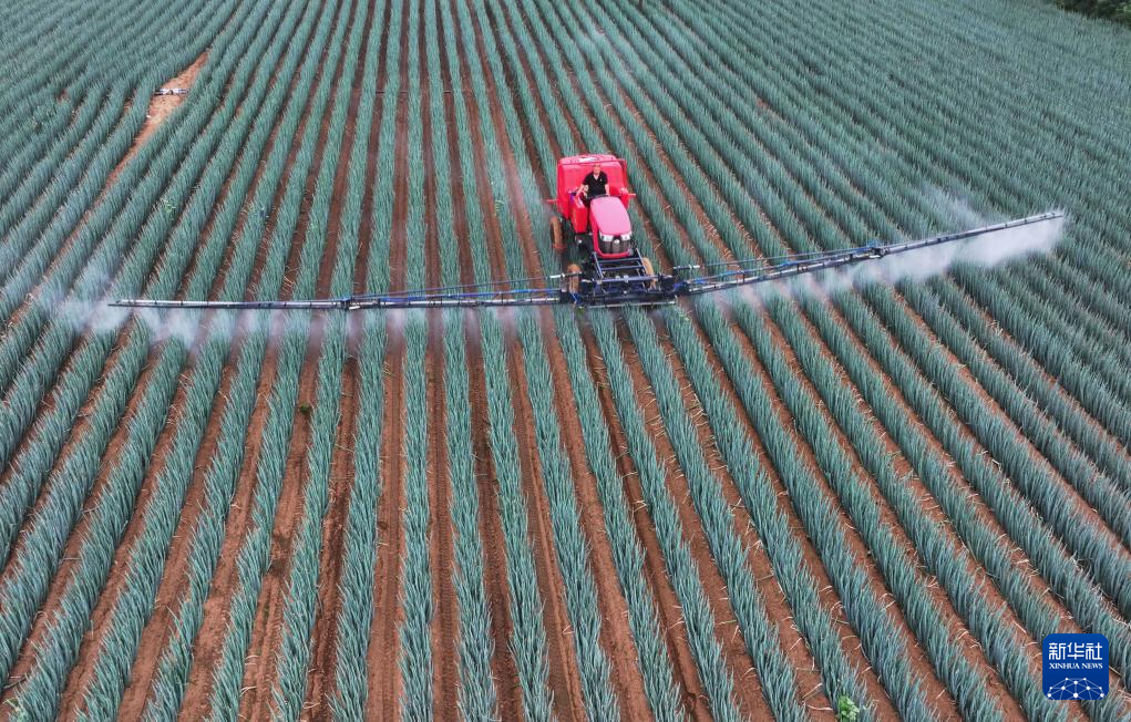 7月24日,河北省隆化县汤头沟镇一家蔬菜种植合作社的社员使用机械设备给大葱喷洒杀菌剂(无人机照片)。