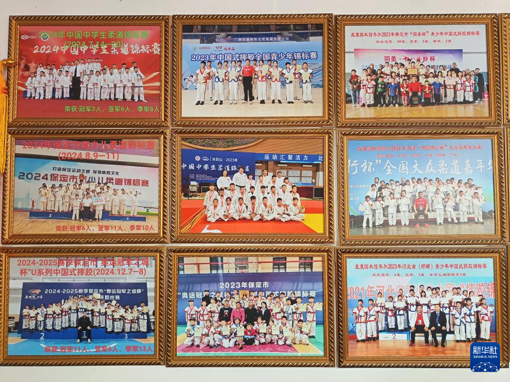 5月7日,摔跤馆墙上挂满了白鹤江带孩子们参赛的合影。新华社记者 杨帆 摄